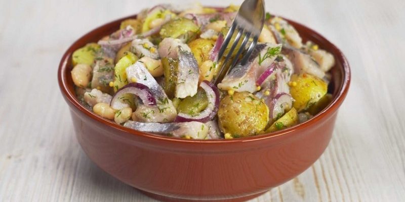 Аппетитный и очень вкусный картофельный салат с селедкой, белой фасолью и солеными огурчиками. Его обязательно стоит приготовить, тем более, что для этого