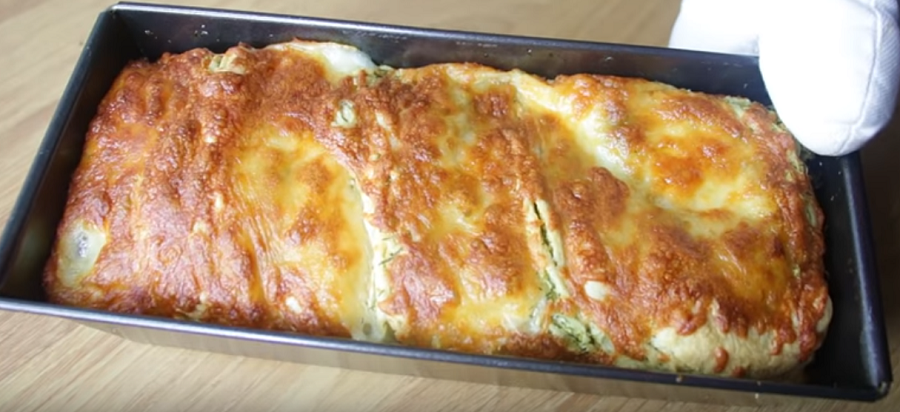- Получившуюся заготовку перекладываем в форму для выпечки, промазанную растительным маслом. Сверху присыпаем тертым сыром, накрываем полотенцем и оставляем на 30 минут.