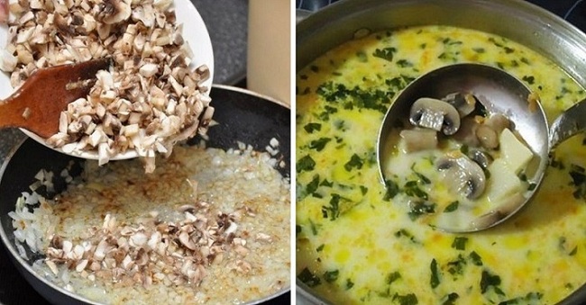 Пожалуй, самый распространенный вариант сырного супа. Для тех, кто любит грибы, отличный вариант.