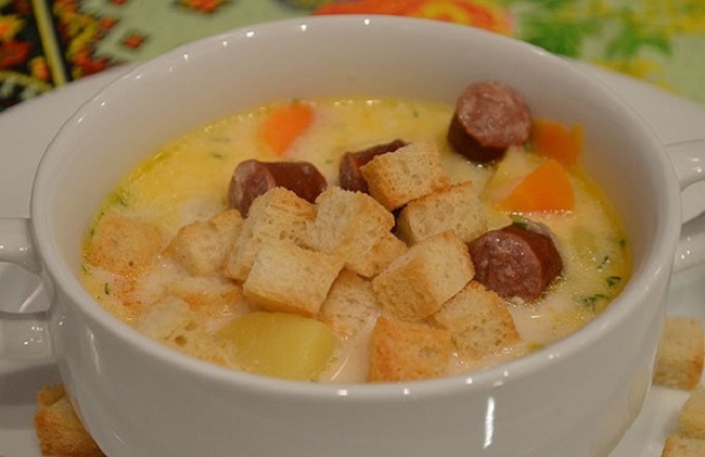 Сырный суп с копчеными колбасками