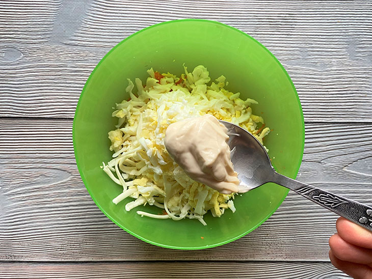 6. Заправьте ингредиенты майонезным соусом и хорошенько перемешайте.