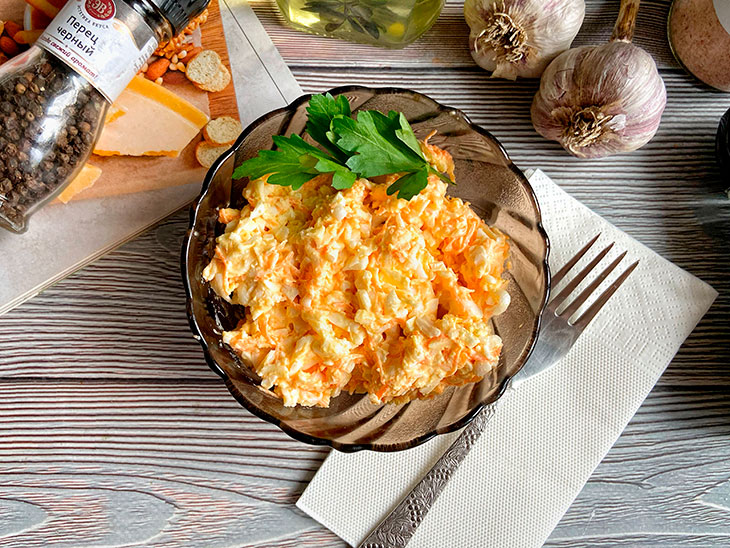 Этот салат готовится всего из трех ингредиентов и, кажется, проще уже ничего нельзя придумать. Тем не менее такой салат уместен всегда и на любом столе. Остается только отрегулировать остроту при помощи чеснока, и универсальная закуска на любой вкус готова. Так как салат весьма калорийный, он быстро утоляет любой голод.