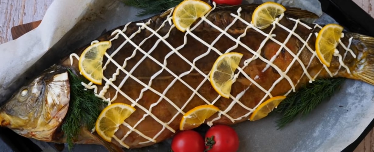 - Зашиваем брюшко и перекладываем на противень. Смазываем растительным маслом и отправляем в духовку, разогретую до 180 градусов. Запекаем в течение 45 минут. Сверху делаем рисунок из майонеза и выкладываем лимонные дольки.