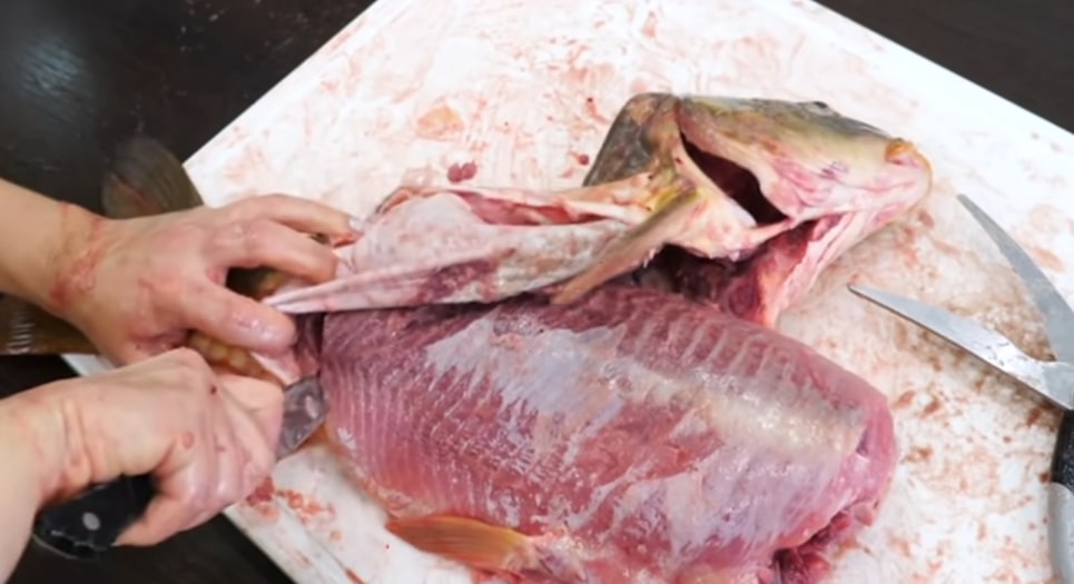 - Очищаем рыбку от чешуи и внутренностей, убираем жабры. Берем нож и делаем надрез между шкуркой и мясом рыбки, аккуратно отсоединяем шкурку от мяса, но не отрезаем ее полностью. Затем откидываем голову, выворачивая ее и с помощью ножниц отделяем хребет от кожи. Потом отрезаем хвостик.