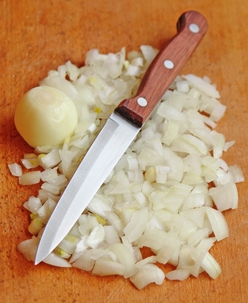 2. Лук мелко нашинкуй и пропусти его через мясорубку. Затем измельчи чеснок и петрушку.