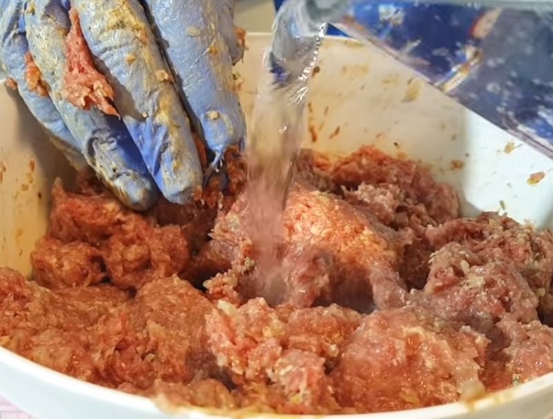 - Постепенно замешивая фарш, добавь в него минеральную воду и бульон.