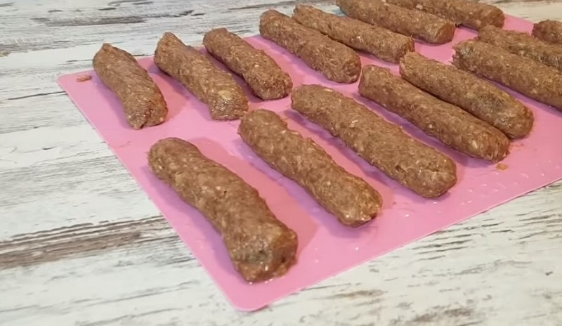 - Достань фарш из холодильника и сформируй колбаски-мититеи. Можно делать это руками, но лучше получается с помощью насадки на мясорубку.