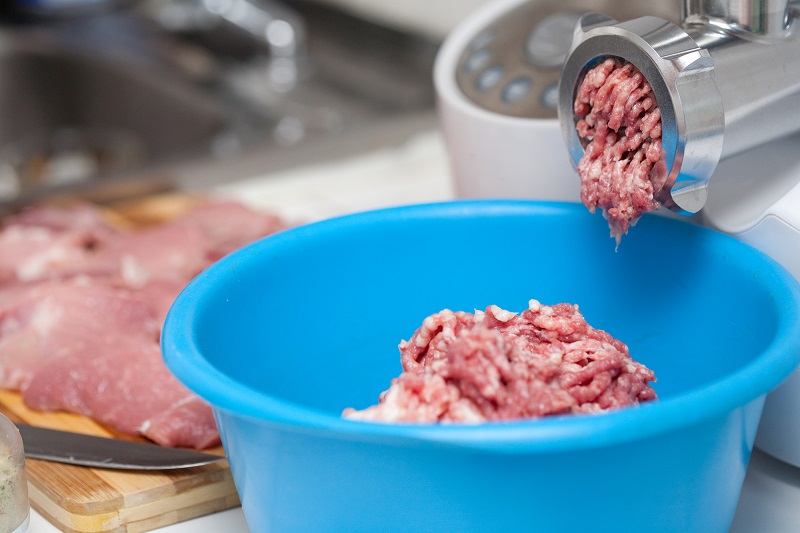 Meat grinder in kitchen and a blue bowl with mincemeat - Чтобы зразы сохраняли форму во время запекания, кроме замоченного в молоке батона, добавь в фарш 2 сырых яйца. Посоли фарш по вкусу, приправь любимыми специями и вымеси руками в однородную массу.