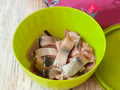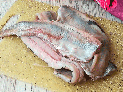 У сельди отрезаем голову, вычищаем внутренности, снимаем кожу, и удаляем хребет с костями. То есть, одну рыбку делим на 2 филе… И, это совсем недолго, и нетрудно! Я засекла время, у меня ушло 9 минут на обработку рыбы, потом ещё 3-4 минуты, которые я потратила на удаление оставшихся крупных косточек в филе.