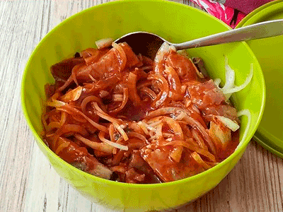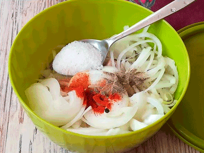 Далее, очищаем репчатый лук, а затем нарезаем его достаточно тонко на полукольца. Нарезанный лук добавляем к селедке. Сюда же кладем сахар, соль, парочку горошин черного перца, по своему вкусу добавляем специи — такие, как паприка, острый перец, чёрный молотый перец, кто любит, может добавить и гвоздичку и лавровый лист