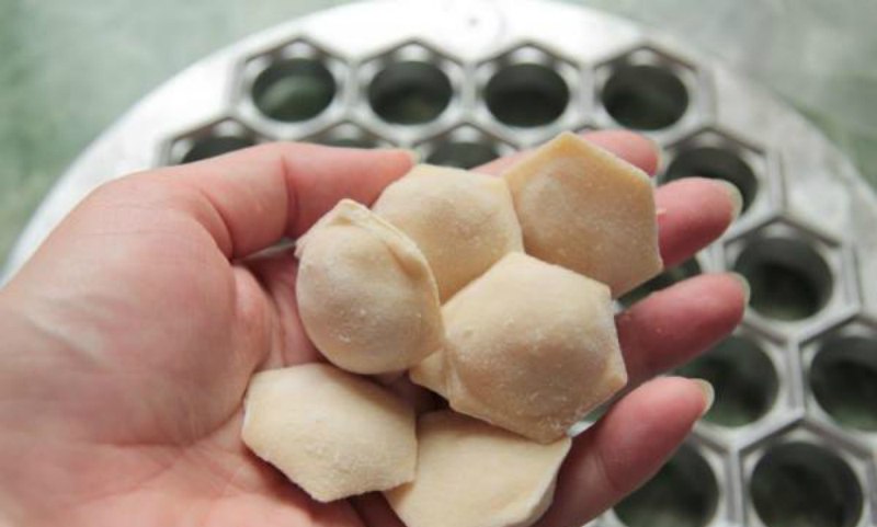 3. Тесто обомните, разделите на 4 части. Одну часть раскатайте в пласт толщиной 2–2,5 мм, накройте им пельменницу. Ячейки заполните начинкой. Накройте вторым раскатанным пластом.