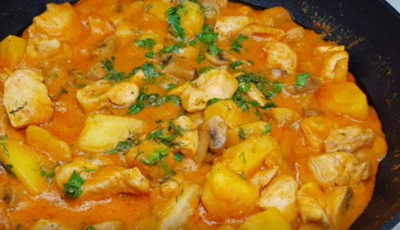- В сковороду, где жарились грибы, кладем картофель и куриное филе. Солим и перчим по вкусу, перемешиваем, накрываем крышкой и тушим на медленном огне 15-20 минут.