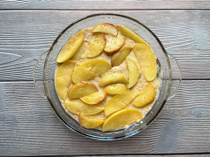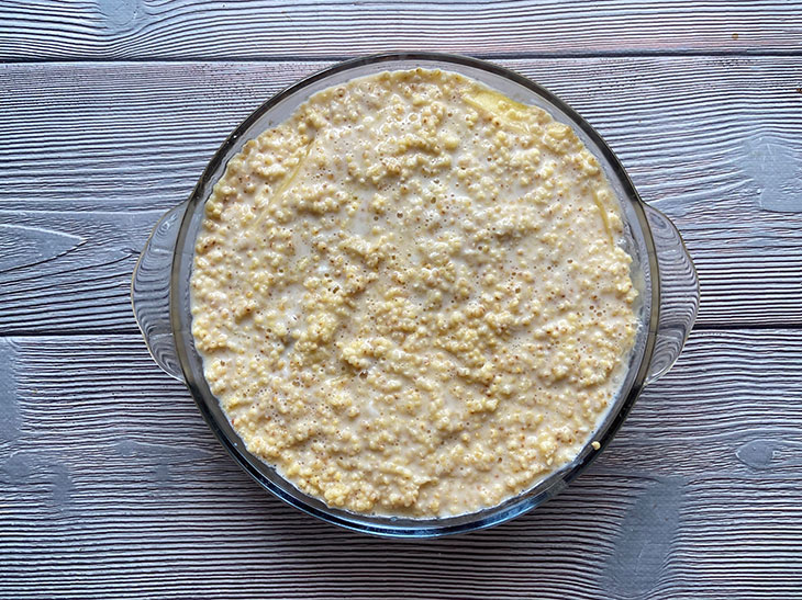 10. Поверх яблок выложите вторую часть каши и отправьте запеканку в духовку на 40 минут.
