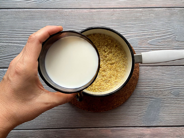 6. Когда вода из пшена полностью выпарится, в кастрюлю налить молоко и продолжить варить, пока каша не загустеет.