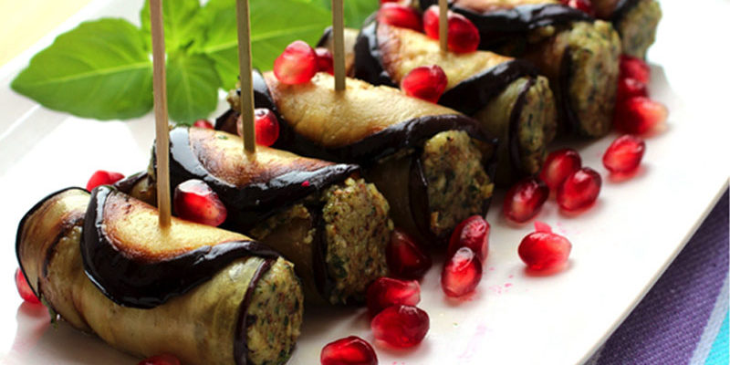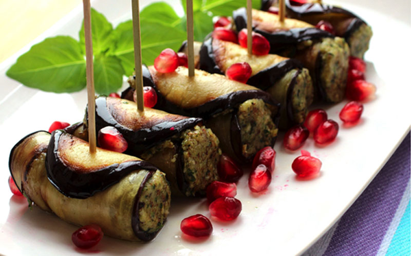 Взять полоску баклажана, выложить на край ореховую начинку, завернуть. То же самое сделать с остальными полосками. Подавать можно с зернышками граната.