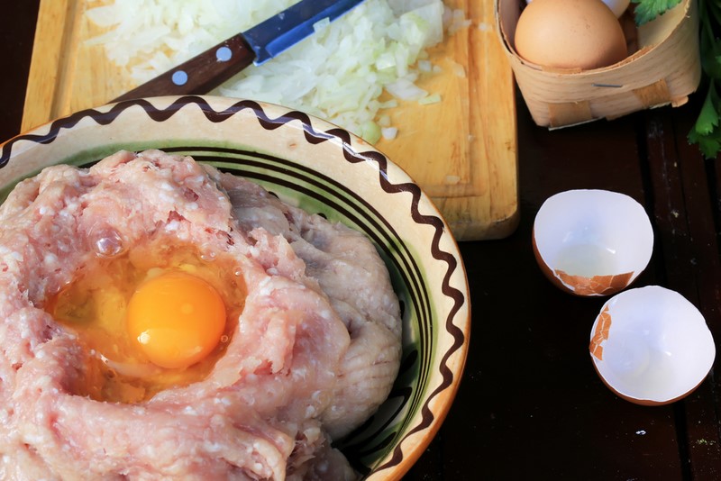 - Мясной фарш немного посоли и поперчи на свой вкус, добавь специи и чеснок. Вбей туда одно куриное яйцо и хорошенько перемешай. Раздели полученный фарш пополам.