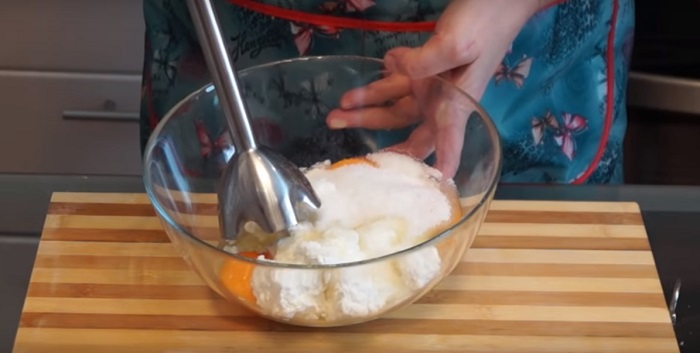 - Творожно-яичную смесь хорошенько взбей при помощи блендера до однородной массы, чтоб не осталось ни одного творожного комочка