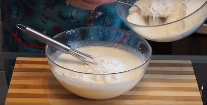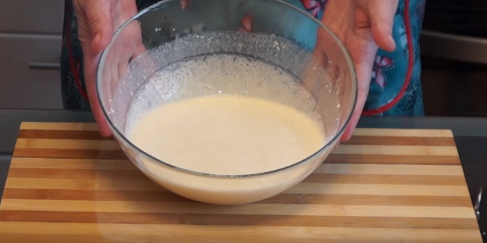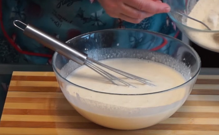 - К взбитой смеси добавь молоко и хорошенько всё перемешай при помощи венчика.
