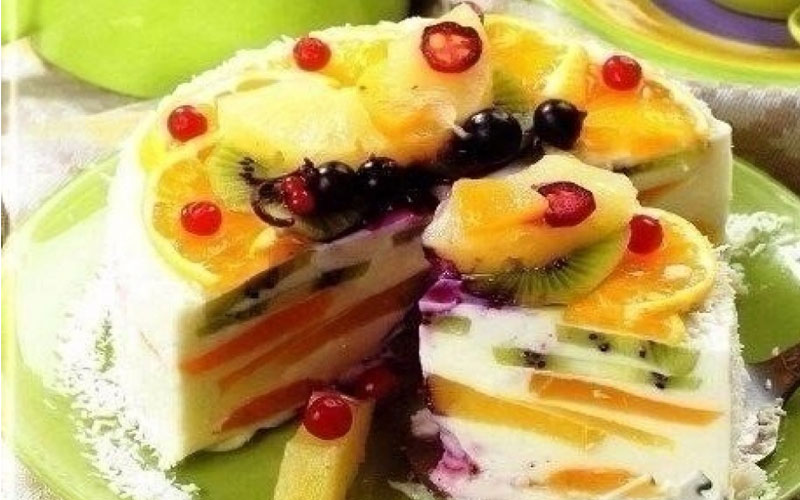В разъемной форме сформируйте слои: дольки мандарина, творожная смесь, кружочки киви, слой смеси, колечки ананаса, снова смесь, ломтики персика и так далее.