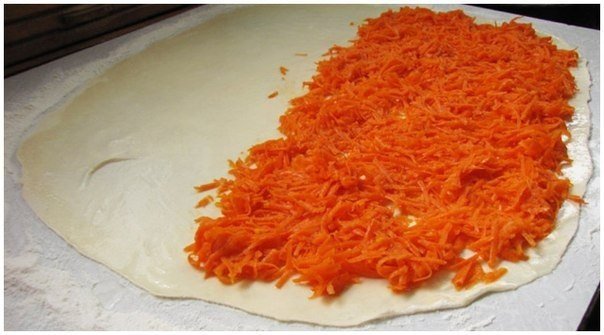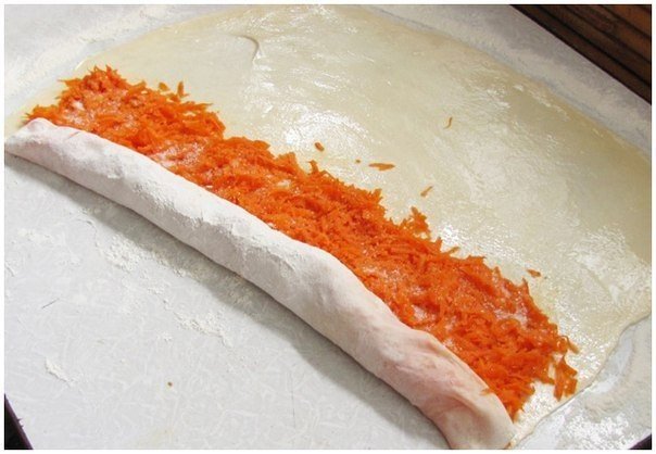Посыпаем тыкву сахаром и заворачиваем рулетом.