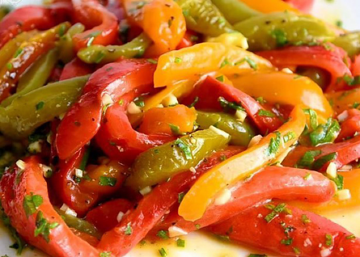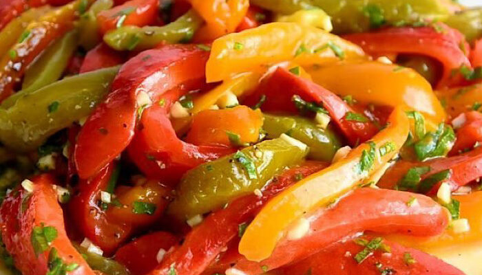7. По истечении нужного времени очищаем перец от пленочки и очищаем от перегородок и семян. Нарезаем полосочками и выкладываем часть в контейнер одним слоем.